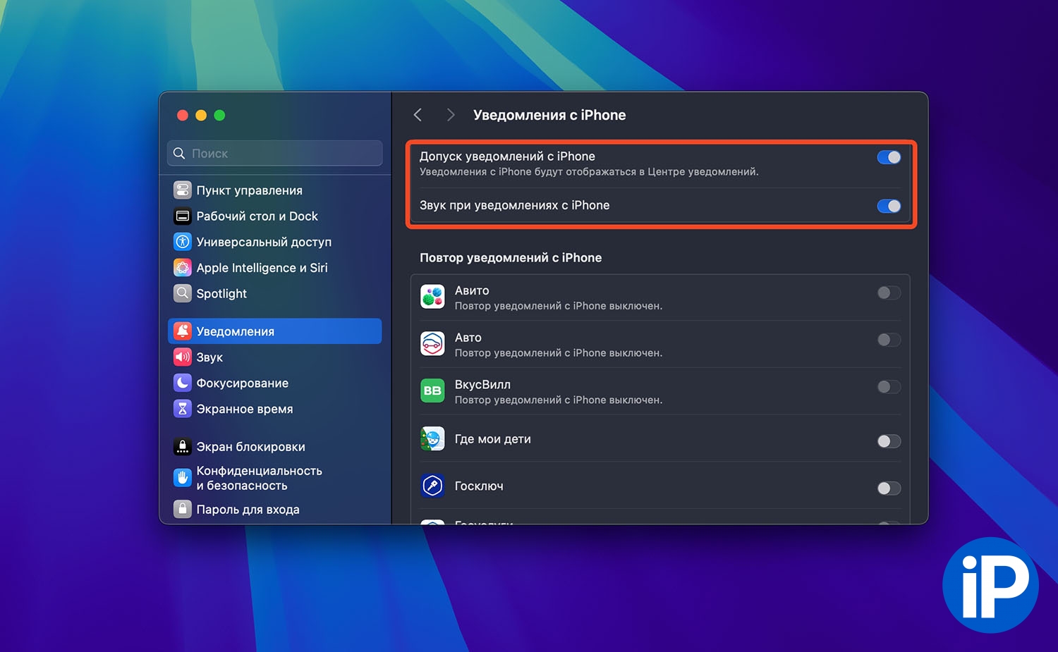 Как включить: сначала включите iPhone Mirroring по нашей инструкции, а затем перейдите в Системные настройки – Уведомления – Допуск уведомлений с iPhone. В этом разделе сможете включить уведомления, звук для них и выбрать приложения с iPhone, которые смогут дублировать уведомления на Mac.