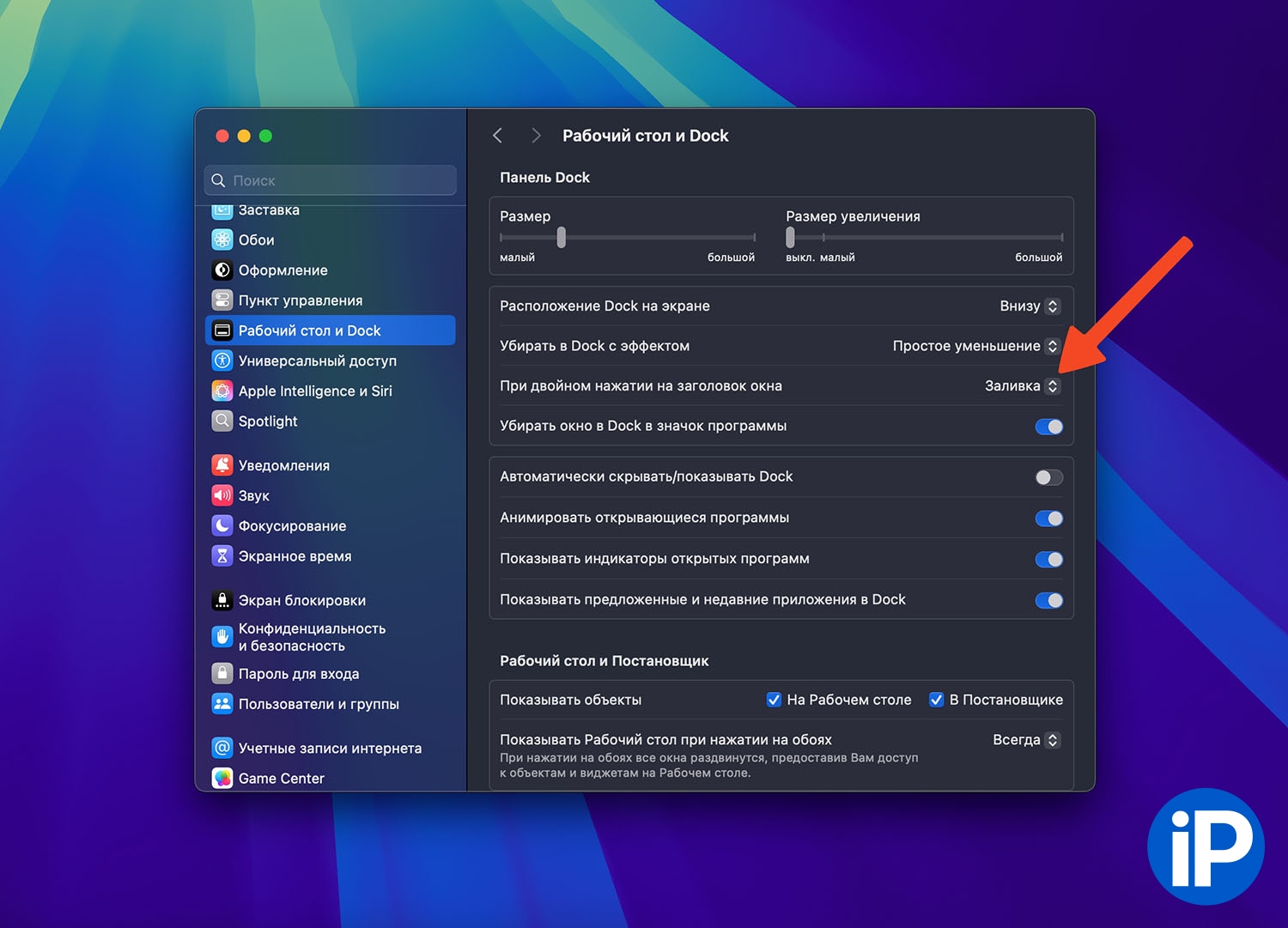 Как включить: откройте Системные настройки – Рабочий стол и Dock – При двойном нажатии на заголовок окна и измените значение на Заливка.