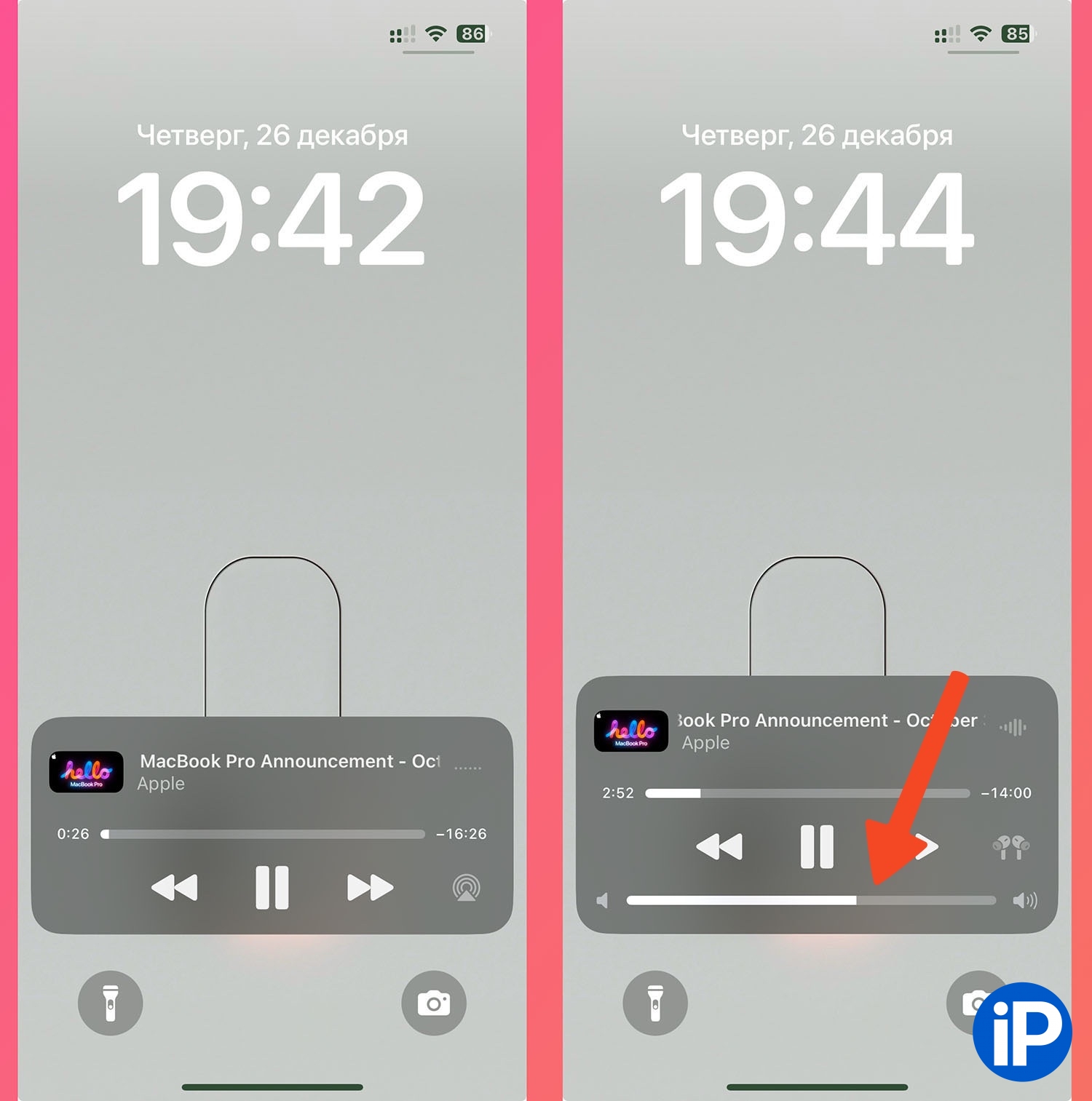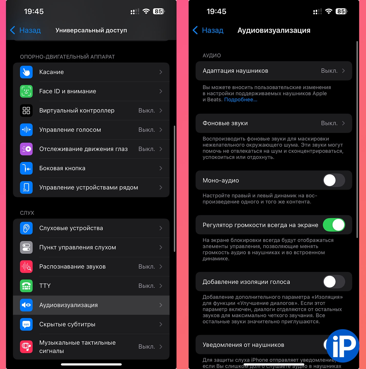 Интересная опция появилась в настройках универсального доступа. Она добавляет ползунок регулировки громкости, когда к iPhone подключены наушники и воспроизводится музыка.