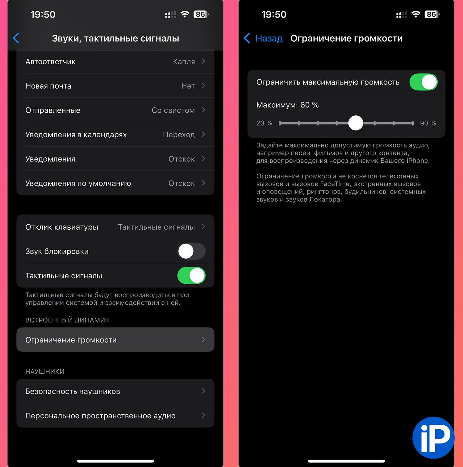 Новая опция в меню настроек звука позволяет ограничить максимальную громкость при воспроизведении контента через динамик iPhone. Это не коснется рингтонов, звука уведомлений и будильника.