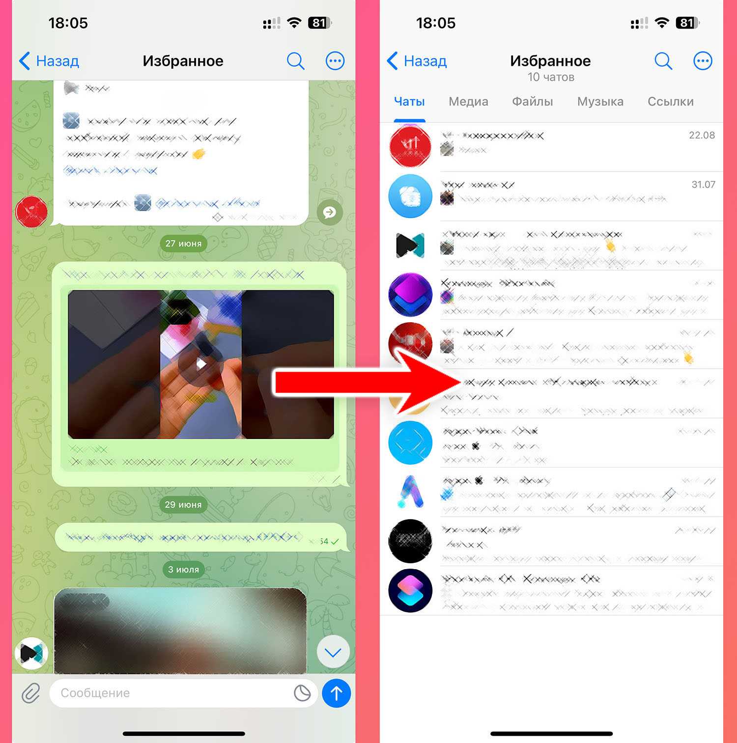 Как включить: откройте чат Избранное, нажмите три точки в правом верхнем углу и выберите режим В виде чатов. Теперь все сообщения будут разделены на каналы, чаты и группы из которых они сохранены.
