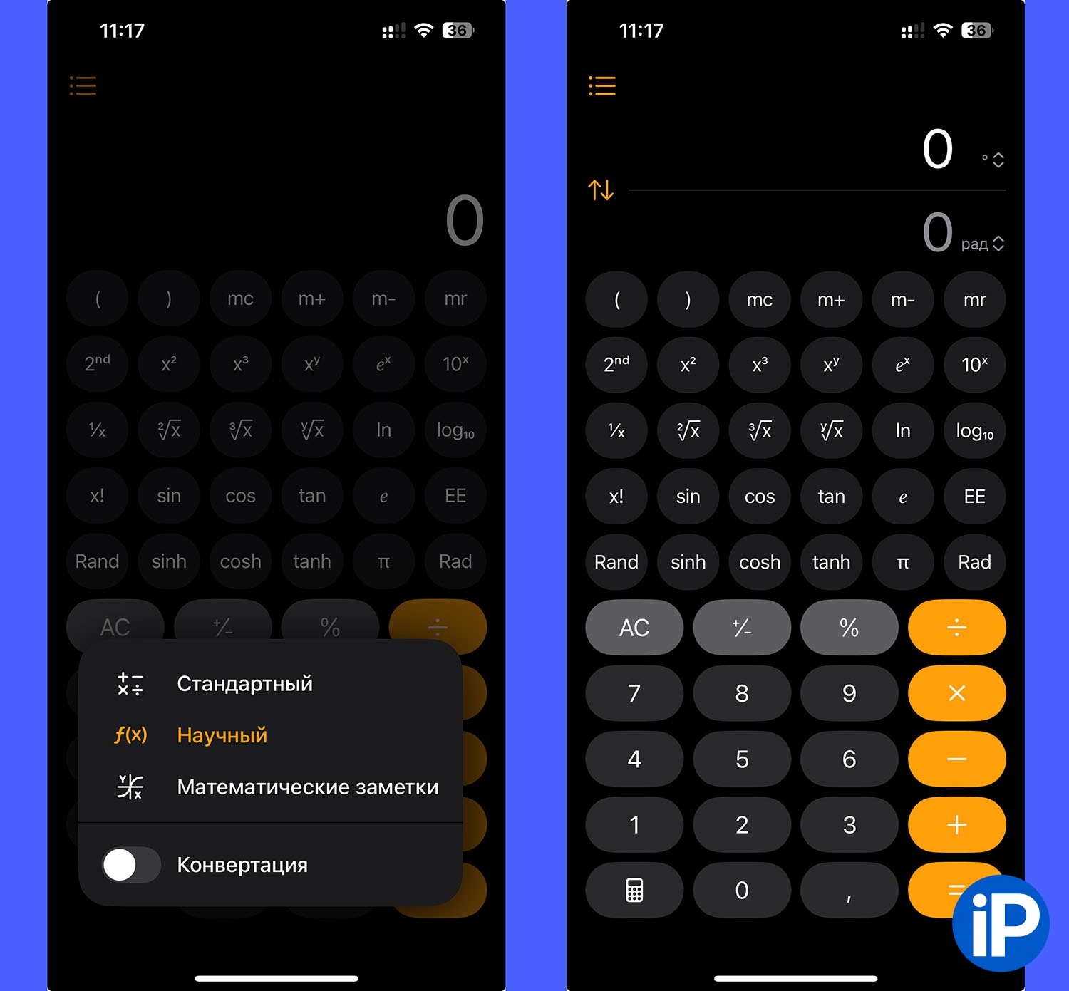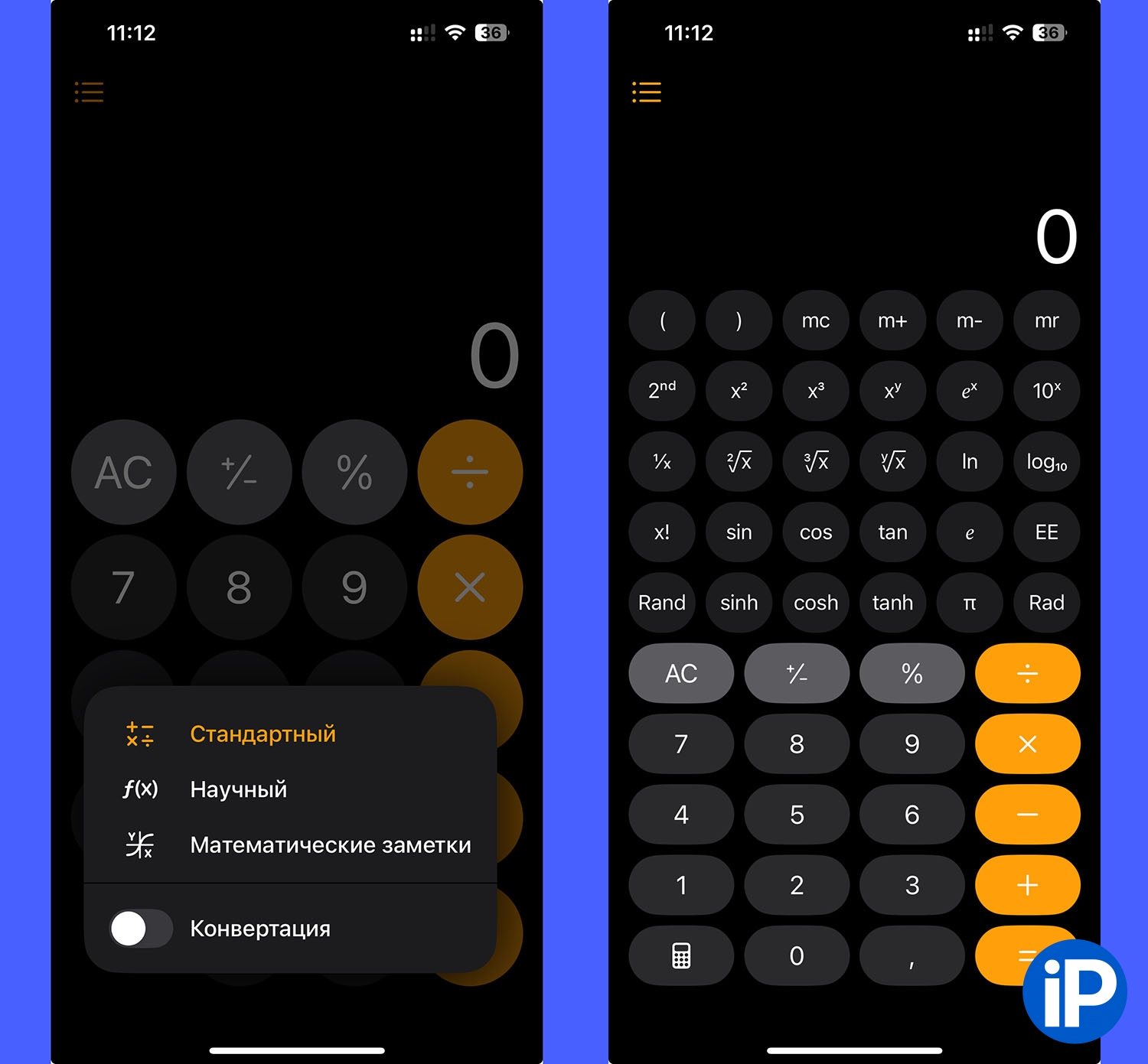 В предыдущих версиях iOS калькулятор сам переключался в научный режим, если повернуть iPhone в ландшафтную ориентацию. В iOS 18 все изменилось. Научный режим стал доступен и в портретной ориентации, а в ландшафтной добавили обычный калькулятор без дополнительных кнопок.