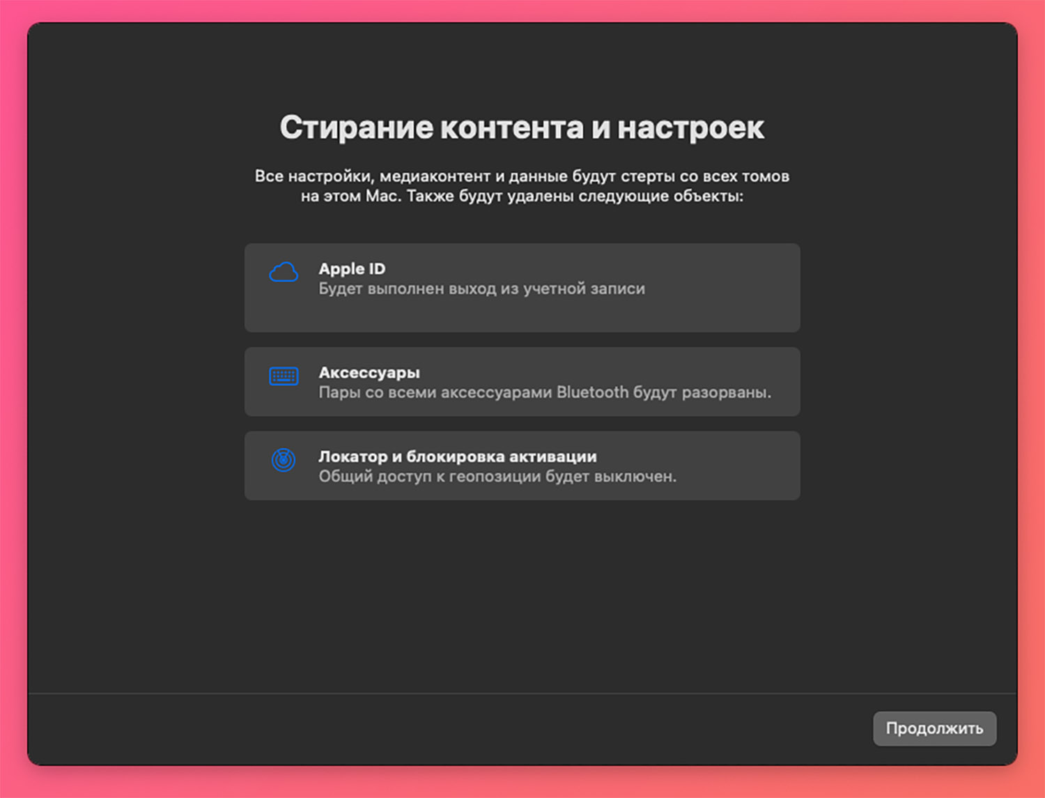Через несколько минут все данные и сторонние приложения будут удалены с компьютера. Система отключит опцию Найти этот Mac и выйдет из учетной записи Apple ID.