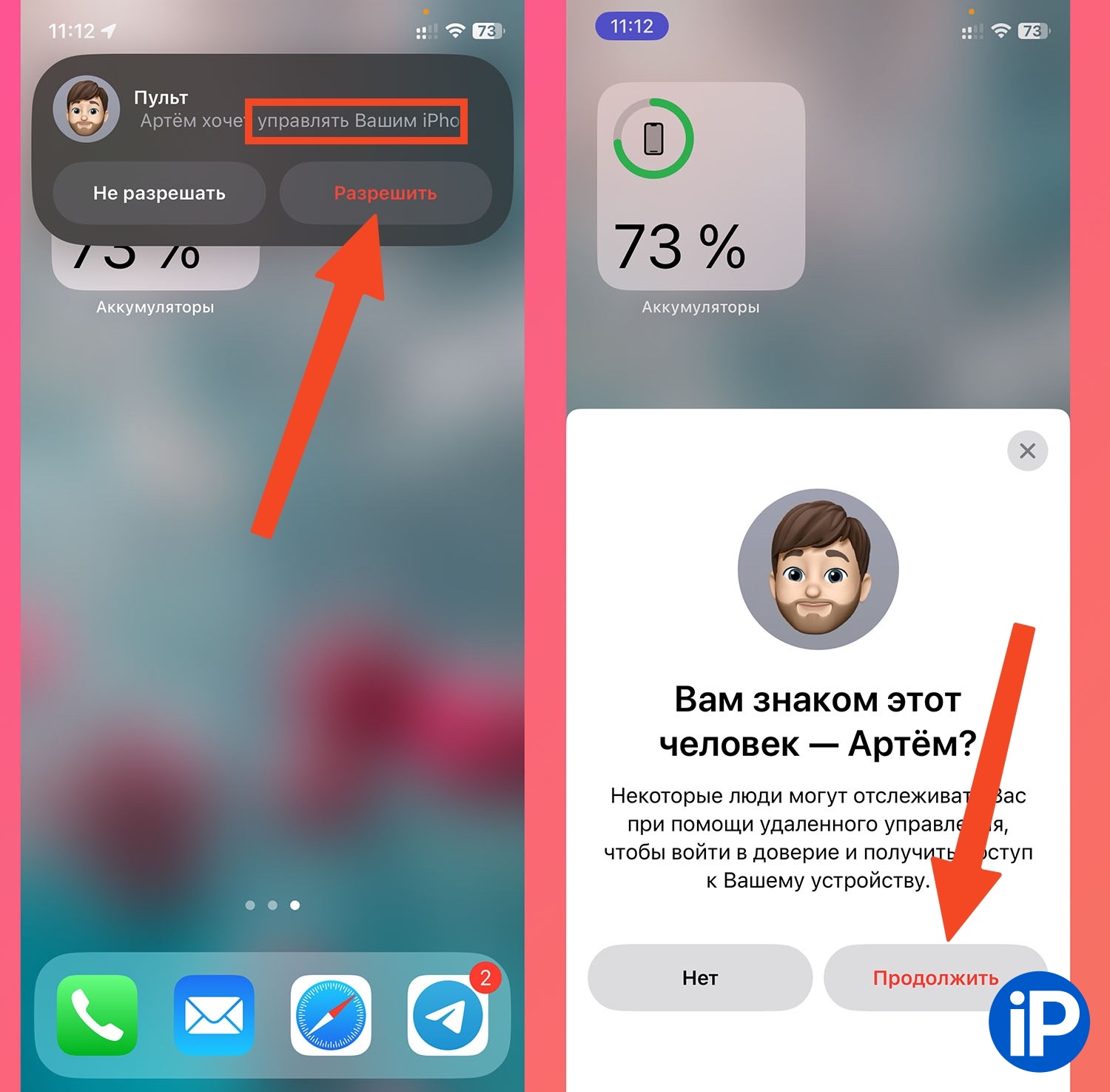 7. Собеседник увидит еще один запрос, на этот раз на удаленное управление гаджетом. Ему нужно подтвердить запрос, при первом подключении увидите дополнительное окно с предупреждением.