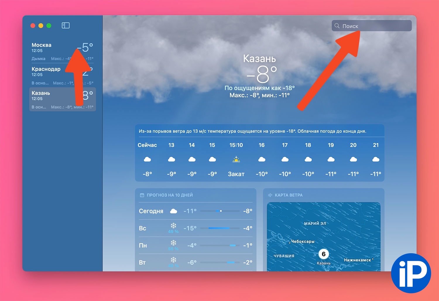 2. В поиске введите название города, для которого хотите получать погоду в строке меню, и добавьте его в приложение.