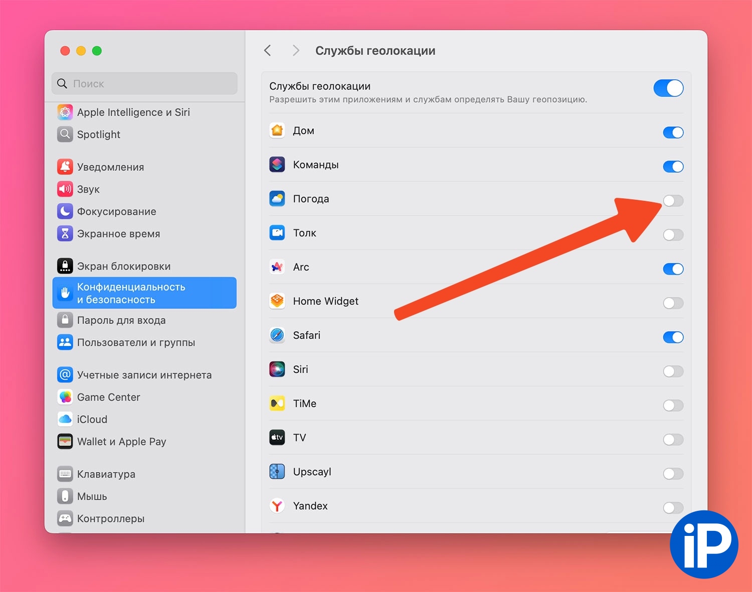 4. Если хотите получать погоду для текущего расположения по геолокации, включите тумблер по пути Системные настройки – Конфиденциальность и безопасность – Службы геолокации – Погода.