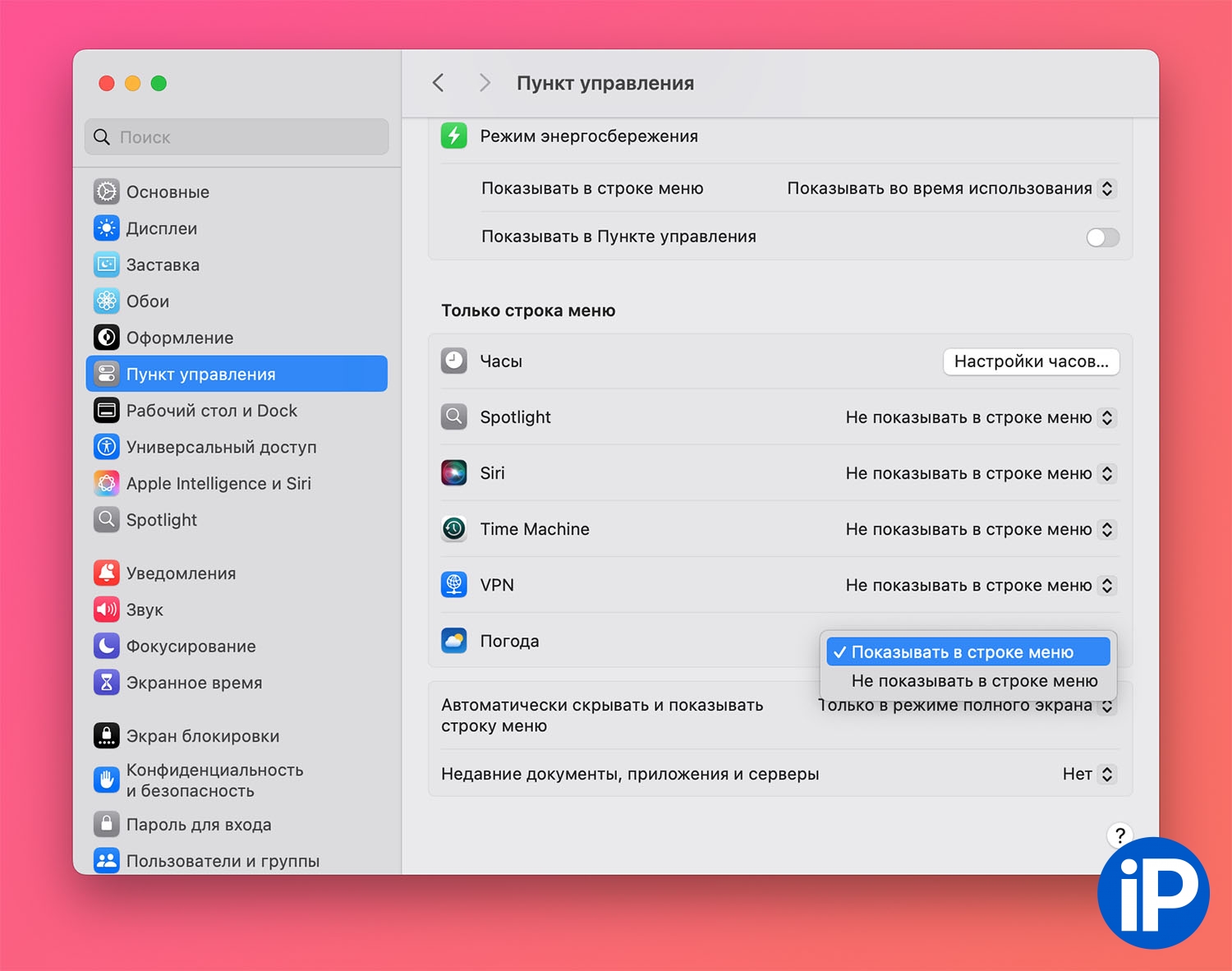 5. Перейдите в Системные настройки – Пункт управления и включите отображение для приложения Погода.