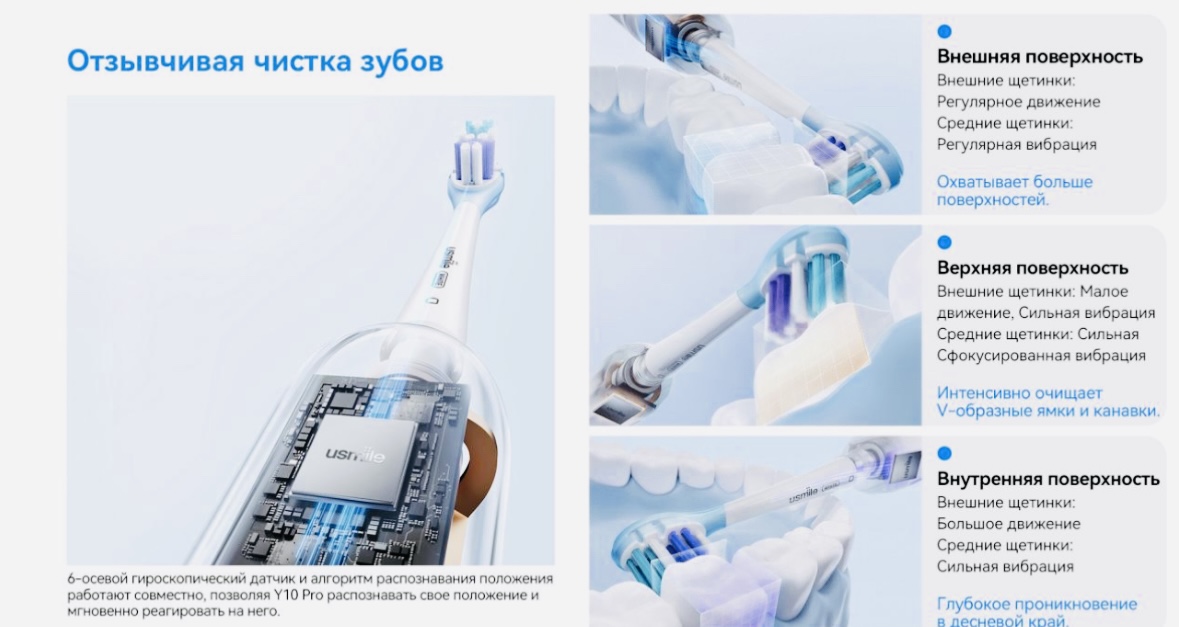 Y10 Pro решает все основные проблемы, с которыми сталкиваются владельцы других электрических щеток: с высокой амплитудой вибрации, кровотечением десен и так далее.