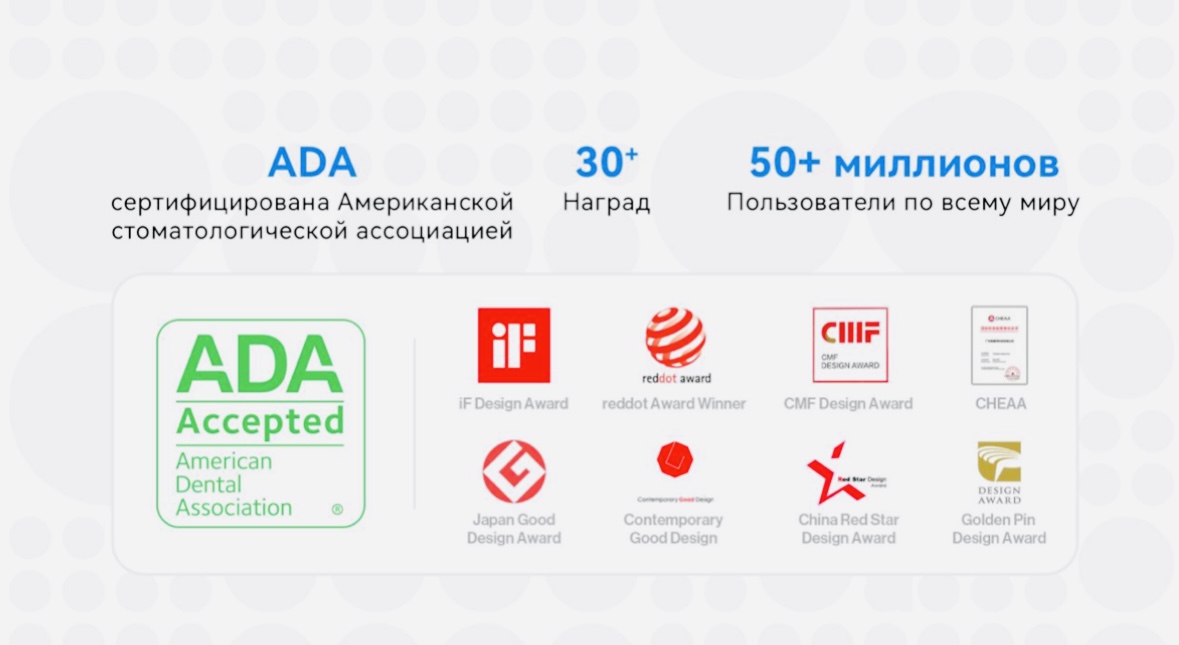 Новинка сертифицирована американской стоматологической ассоциацией (ADA) и соответствует всем современным стандартам качества.
