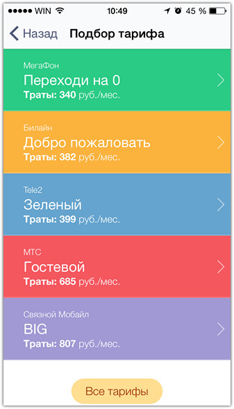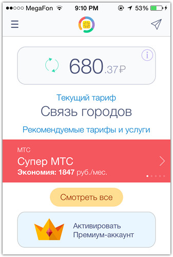 Столкнувшись с проблемой, что приложение отсутствует в американском App Store, я решил не отчаиваться и зарегистрировался в российском. Я уже менял оператора и меня порадовало, что программа сразу определила, какой у меня сейчас. Проанализировав статистику, приложение предложило мне варианты тарифов. Насколько я понимаю, чем дольше ей пользуешься, тем релевантнее её предложения.