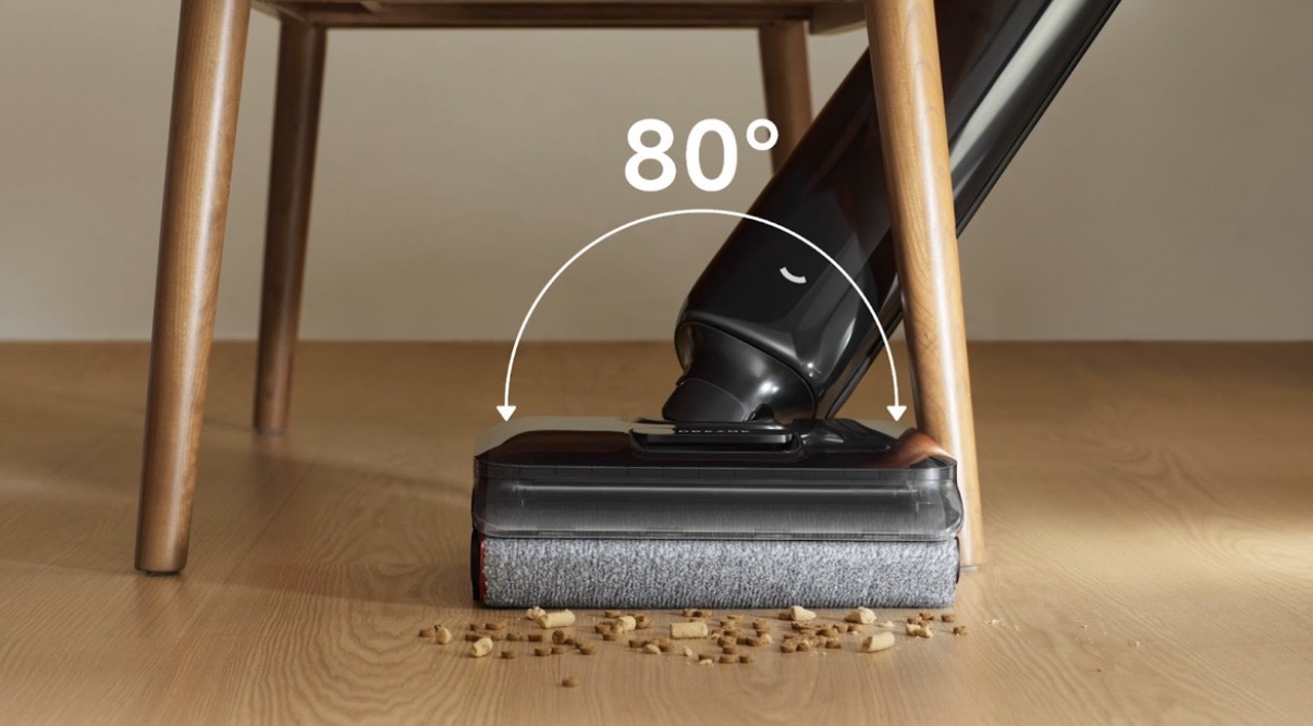 Вес устройства составляет 4,7 кг. Поворот корпуса и ручки до 80 градусов упрощает уборку в узких пространствах и между мебелью. На ручке есть LED-экран для отображения уровень загрязнения и текущигл режима работы.