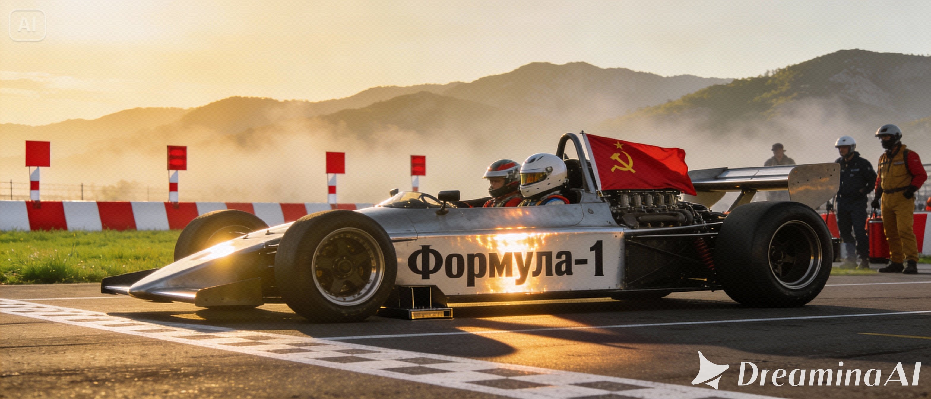 Сделай реалистичное изображение советского боллида на стартовой площадке в Сочи. Используй теплые и мягкие цвета. На боллиде должна быть надпись «Формула-1» на русском языке и советский флаг.