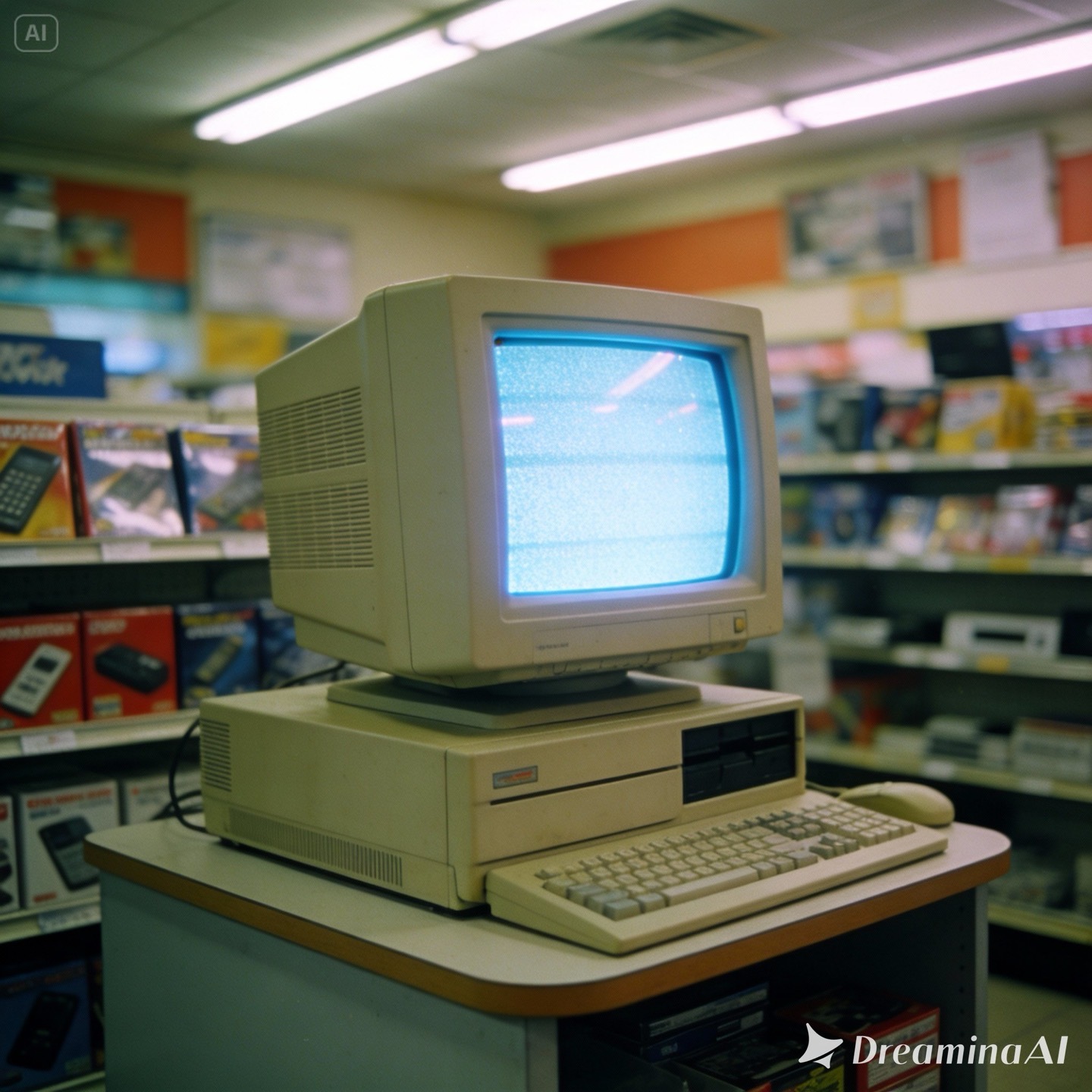 1990s aesthetic, grainy film texture, old CRT computer with a bulky beige case and glowing tube monitor standing on a small retail store counter, late 90s electronics shop interior, fluorescent lighting, shelves with boxed software and accessories in the background, slight VHS noise, low contrast, muted colors, analog photography look, soft blur, realistic, cinematic, nostalgia, shot on 35mm film