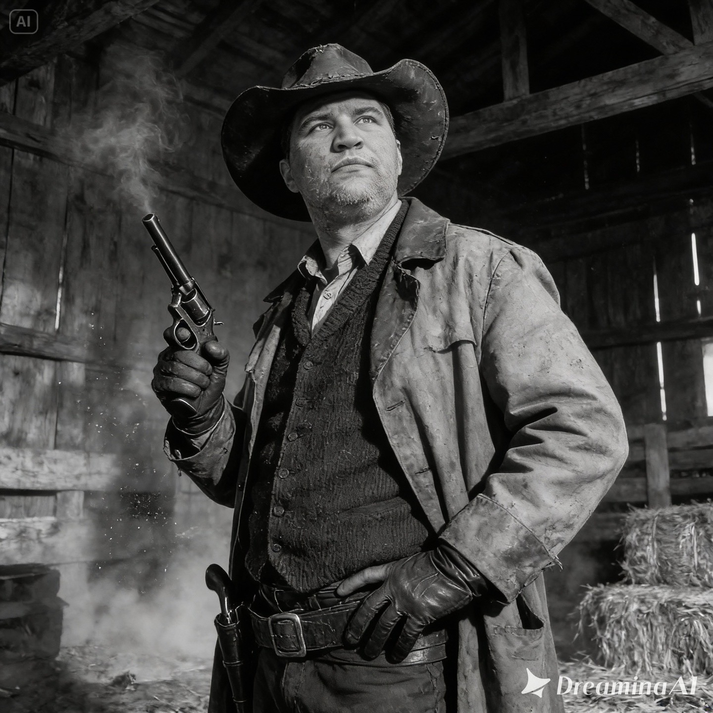 “pose”: “standing, holding revolver, hand on belt”