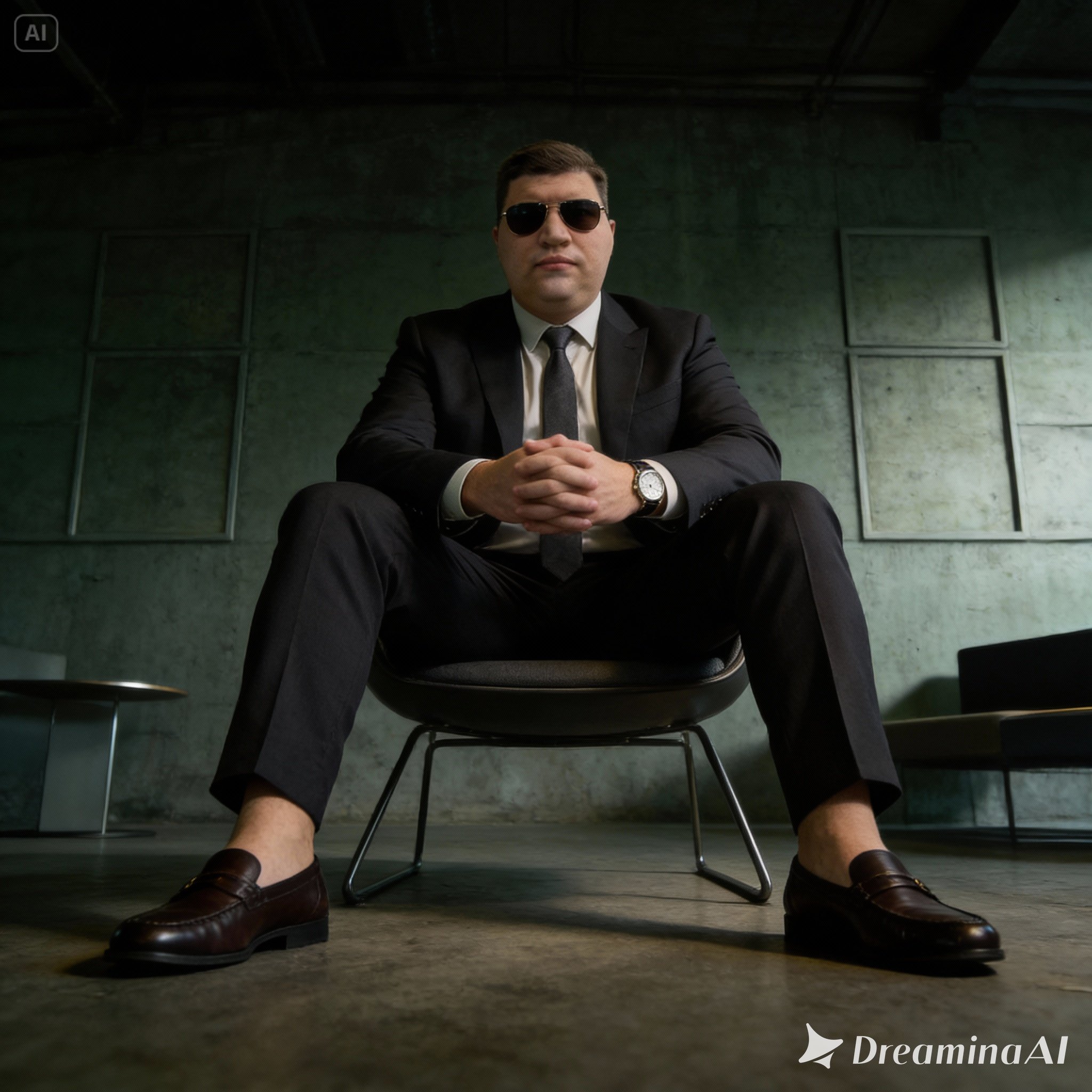 Мужчина уверенно сидит в современном кресле, ноги расставлены, руки сцеплены перед собой,