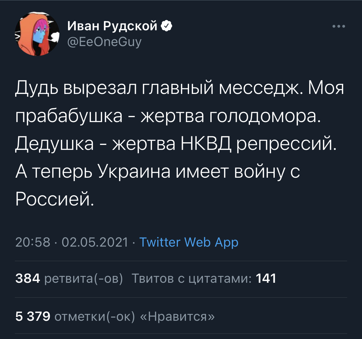3 мая Рудской написал в Twitter о том, что в интервью отсутсвует фрагмент про своих прабабушку-жертву голодомора и дедушку-жертву репрессий НКВД. Твит за сутки собрал более 5 тысяч лайков.