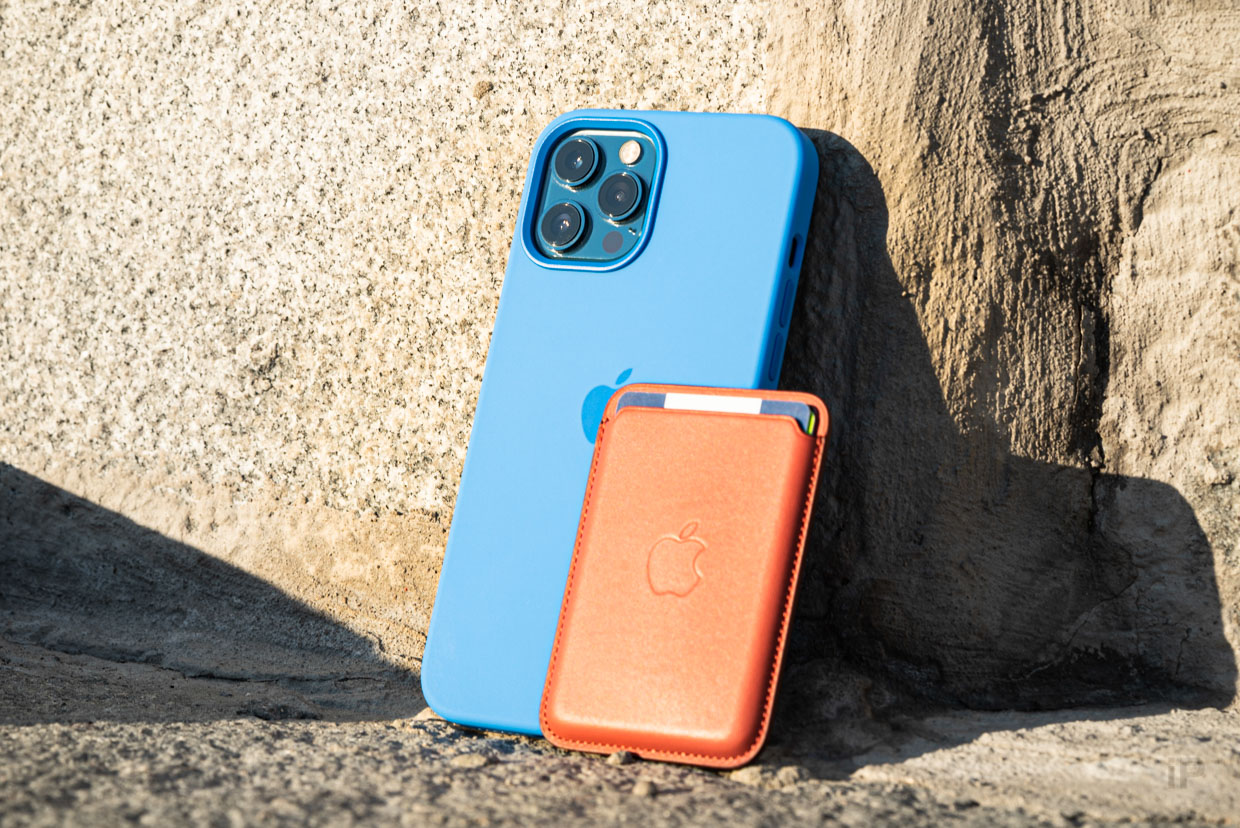 Cиликоновый чехол на iPhone 12 Pro Max цвета «Капри» и кожаный чехол-бумажник с MagSafe цвета «Аризона» из весенней коллекции