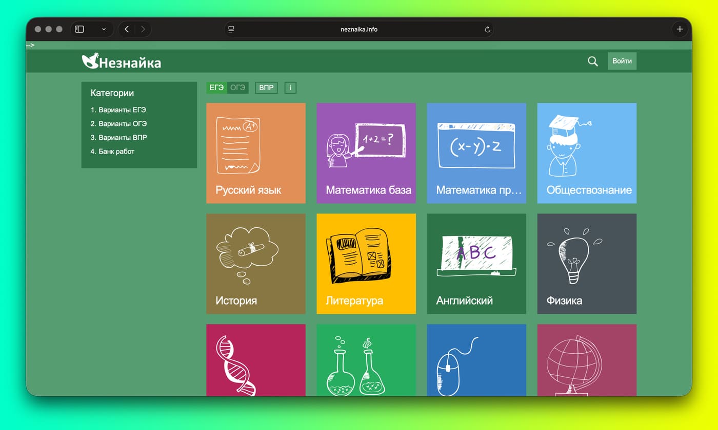 Работа с «Незнайкой» выглядит так: выбрали предмет → открыли вариант или задание по теме → решили → увидели результат → разобрали ошибки.