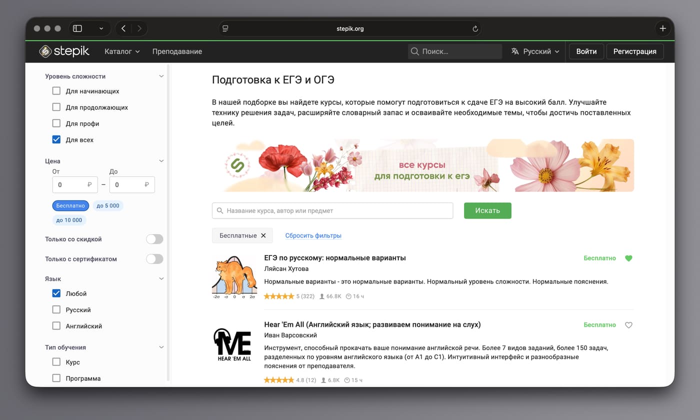 Многие курсы на платформе стоят денег (хотя есть варианты даже за 200–250 рублей), но встречаются и бесплатные программы, например, по Python или русскому языку.
