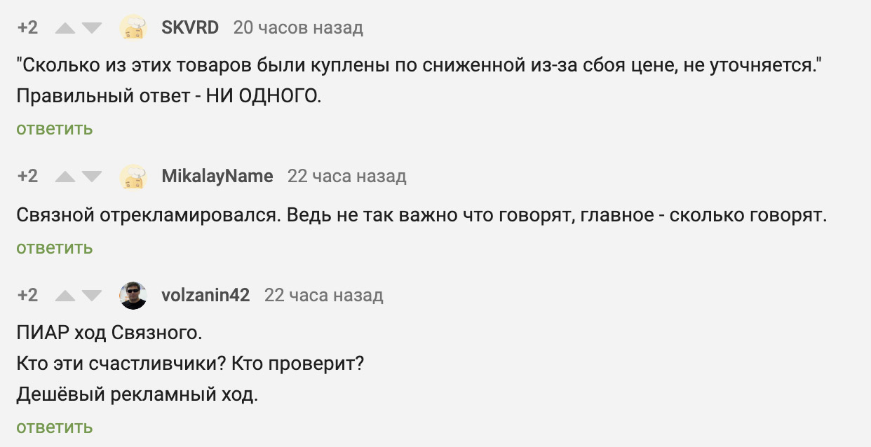 Факт: первая информация про «ошибочные скидки» появилась сразу в СМИ. Например, на РБК пост вышел уже с комментарием пресс-службы «Связной». Мол, смотрите, что у нас произошло, но мы всё исправили.