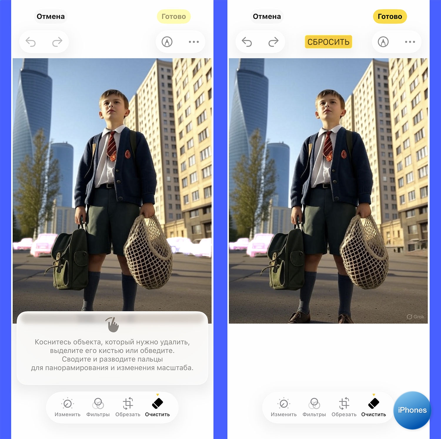 ИИ сам предложит объекты, которые считает лишними или удалит то, что вы зарисуете пальцем на экране. Удаление каждый раз срабатывает по-разному, неудачную попытку можно отменить и попробовать снова. Когда результат устроит, сохраните фото.
