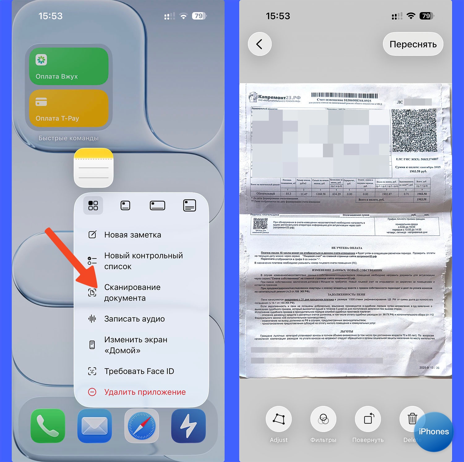 Как это работает: удерживайте палец на иконке приложения Заметки и выберите режим Сканирование документа. Затем наведите камеру на документ и Айфон автоматически сделает фото. Можно обрезать границы документа, применить фильтр или повернуть снимок.