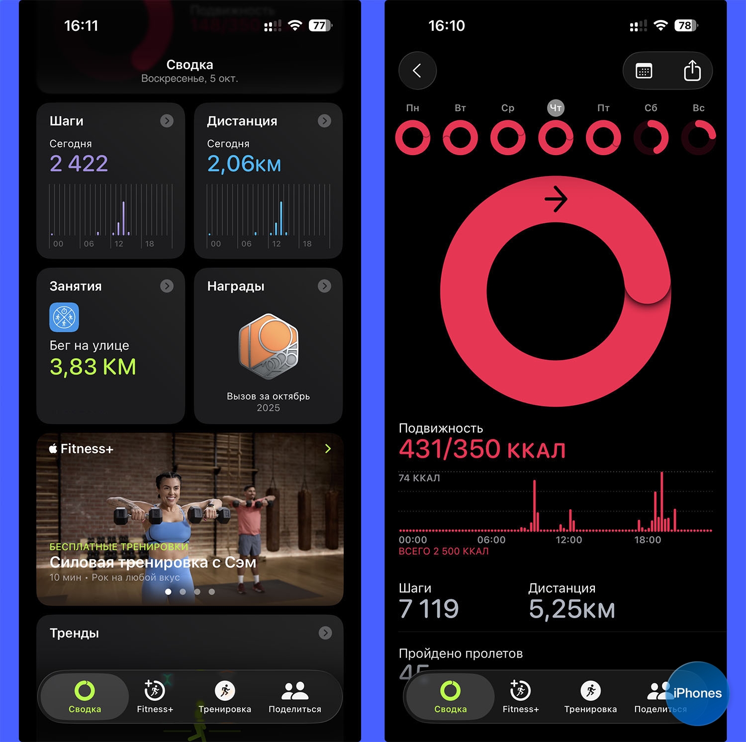 Айфон уже давно умеет считать шаги пользователя даже без Apple Watch и фитнес-браслетов. Специальный алгоритм улавливает раскачивание смартфона при ходьбе и конвертирует это в шаги пользователя. Фишка появилась еще в iPhone 5s, а в iPhone 6 добавили учет пройденного расстояния по лестнице.