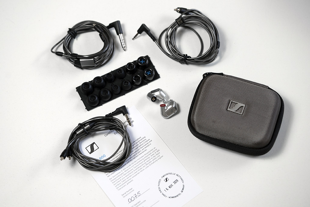 Комплект IE 900 богатый: кроме самих наушников есть и твёрдый кейс, и целая куча насадок из силикона и пены с эффектом памяти трех размеров для любых типов ушей, а главное – целых три кабеля.