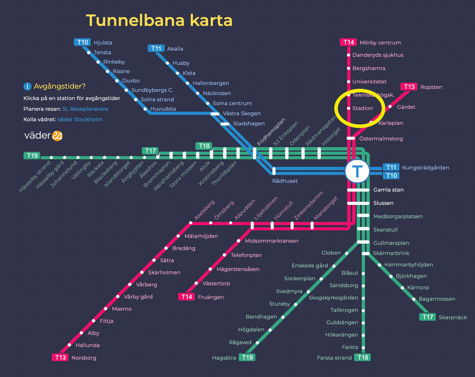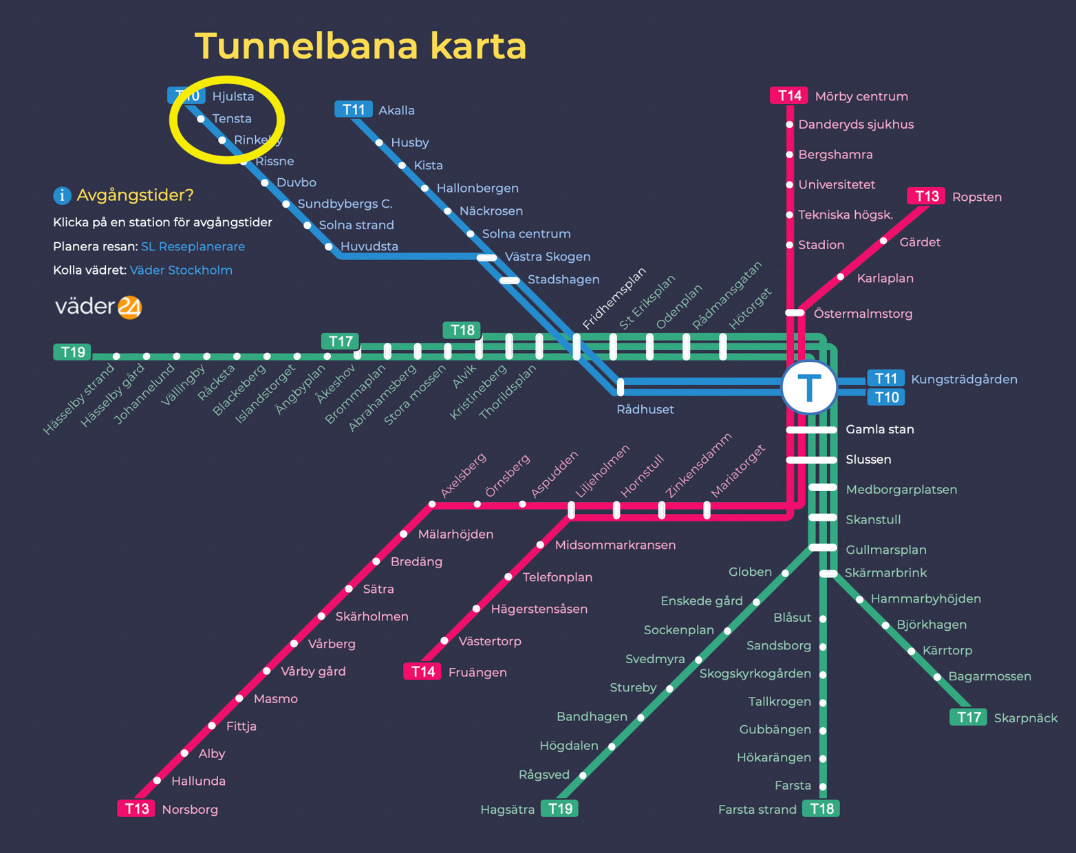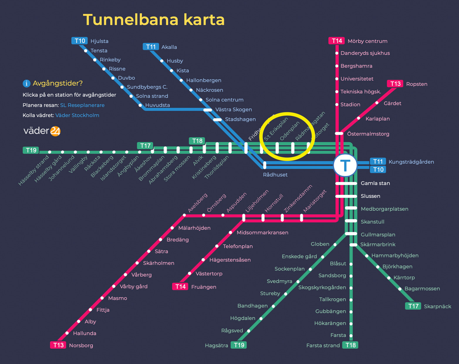 Скриншоты карты с нахождением станций взяты с официального сайта метро Стокгольма