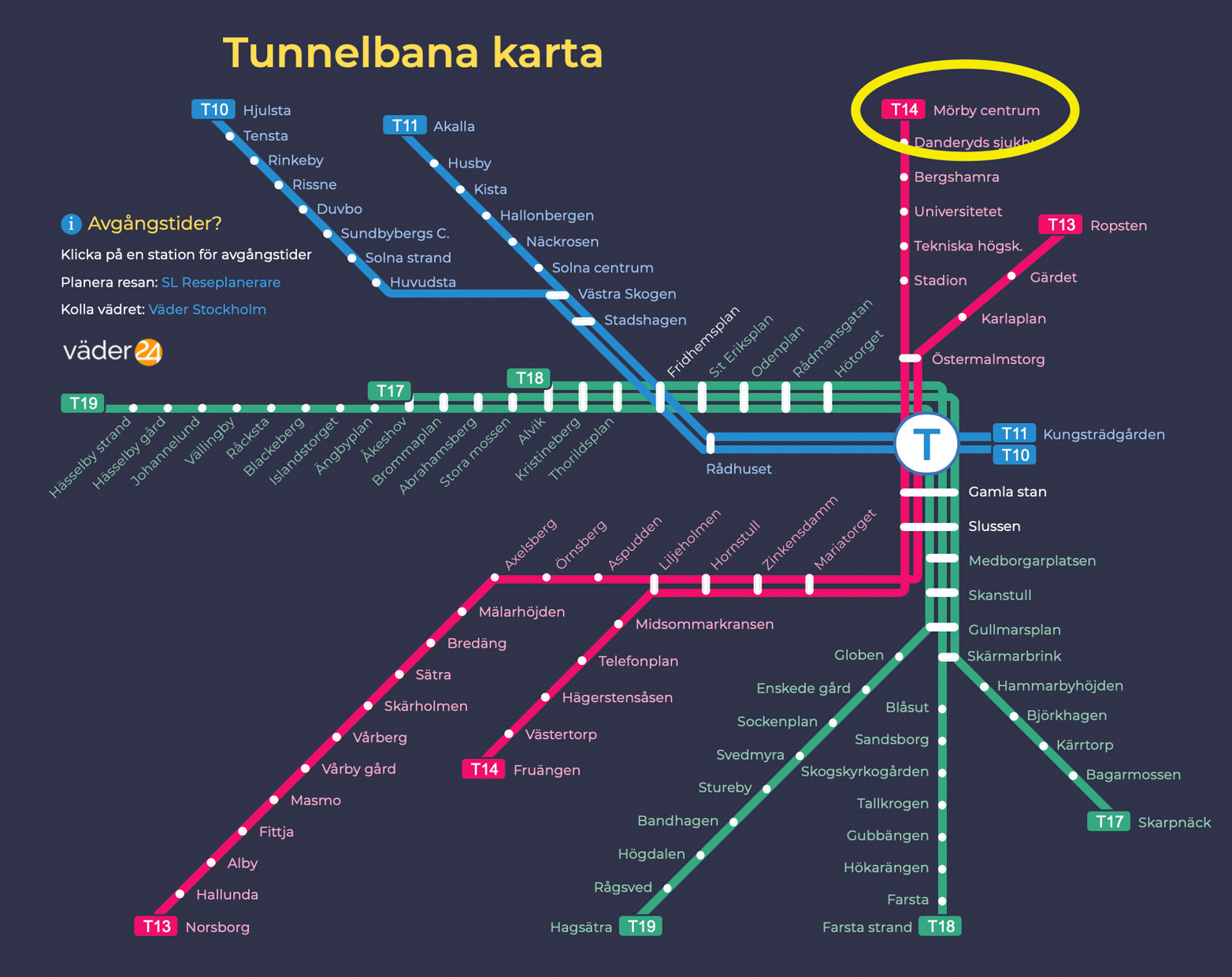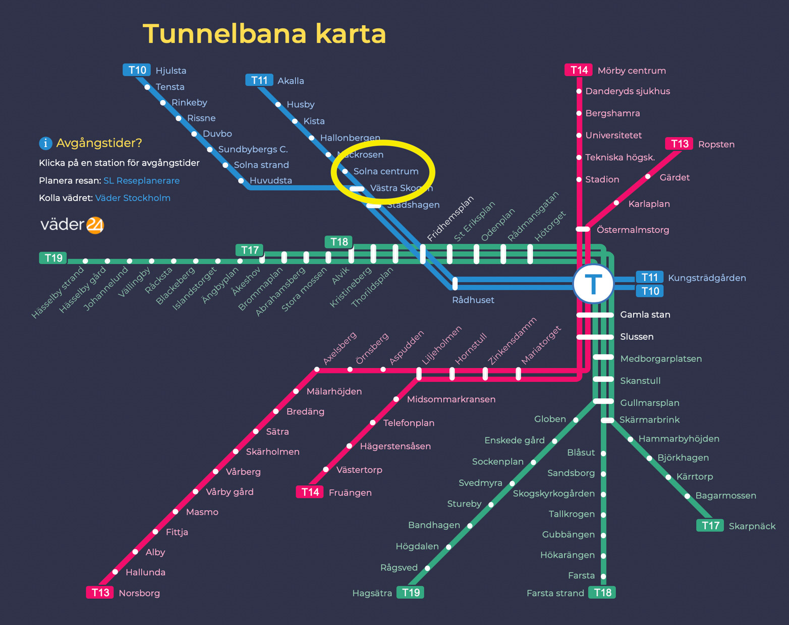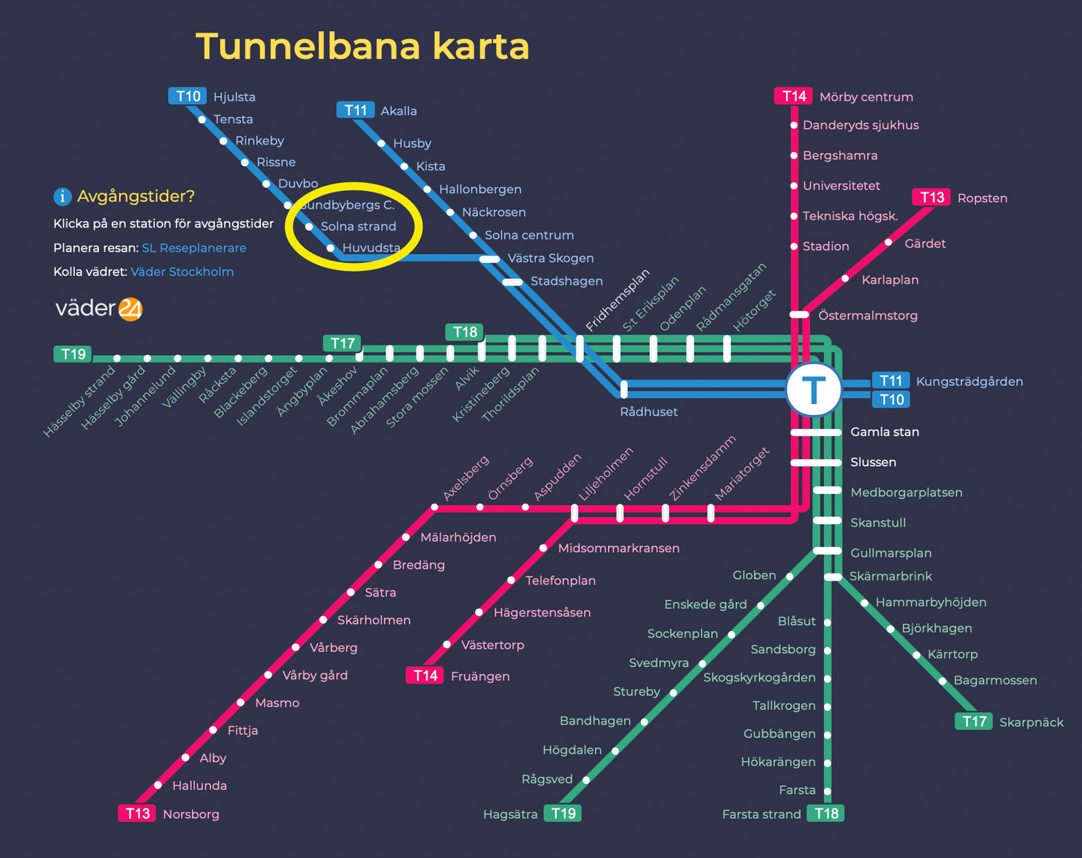 Скриншоты карты с нахождением станций взяты с официального сайта метро Стокгольма