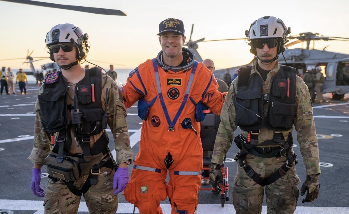 Виктор Гловер и Кристина Кох здороваются с сотрудниками NASA и ВМС США после эвакуации на спасательное судно вслед за приводнением капсулы Orion в Тихом океане.