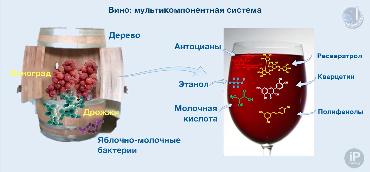Вино, в свою очередь было интересно учёным из-за того, что это мультикомпонентный продукт с огромным количеством биологических процессов при его создании. В напитке каждый элемент влияет на десятки и сотни других, когда меняется сам.