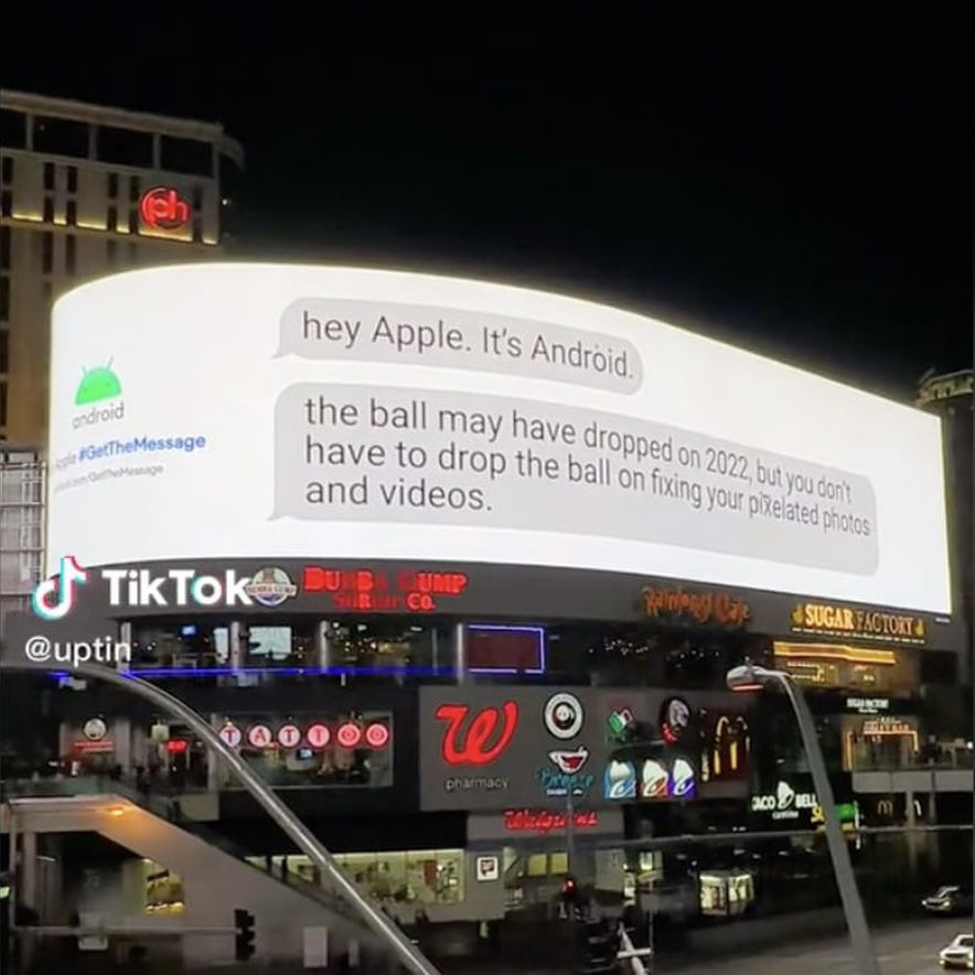 Google is continuing on with its #GetTheMessage campaign attempting to convince Apple to adopt the RCS messaging protocol, this time taking out a large New Year's-themed ad at Harmon Corner in Las Vegas. The digital billboard urges Apple not to "drop the ball" on fixing its "pixelated photos and videos". Hey Apple, it's Android the ball may have dropped on 2022, but you don't have to drop the ball on fixing your pixelated photos and videos.