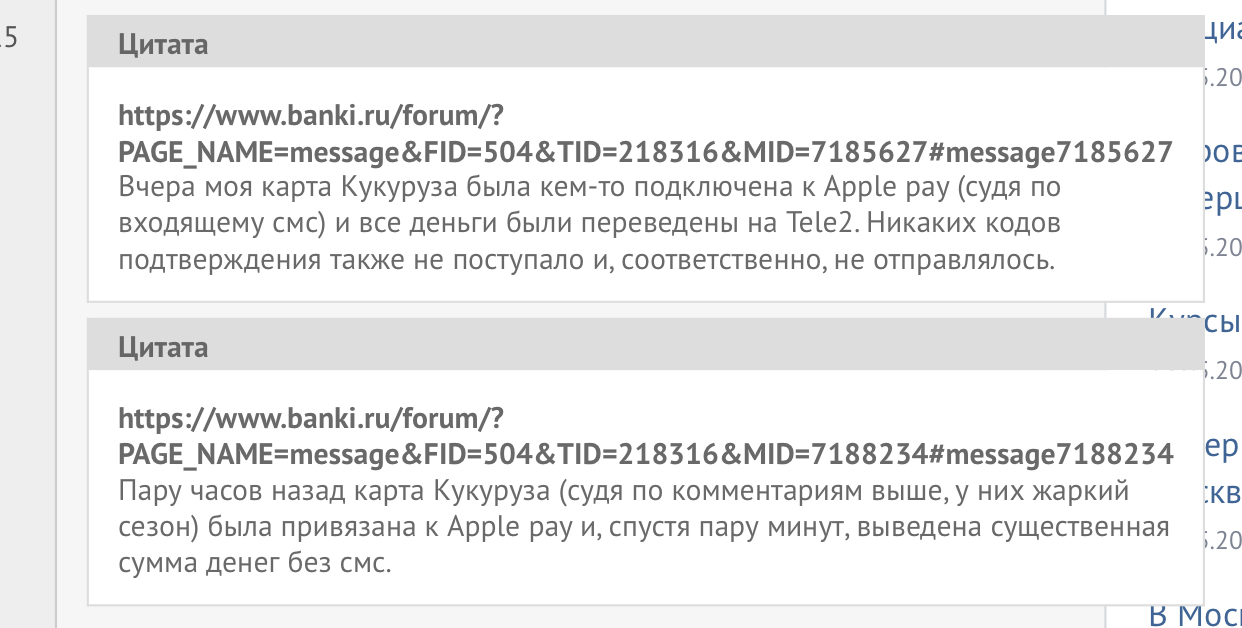 Пользователи рассказывали об этом на сайте Banki.ru, указывая на то, что злоумышленники получили доступ к их логинам и паролям от сервиса. Через приложение Кукуруза можно подключить карту к Apple Pay без подтверждения в СМС или push-уведомлении.