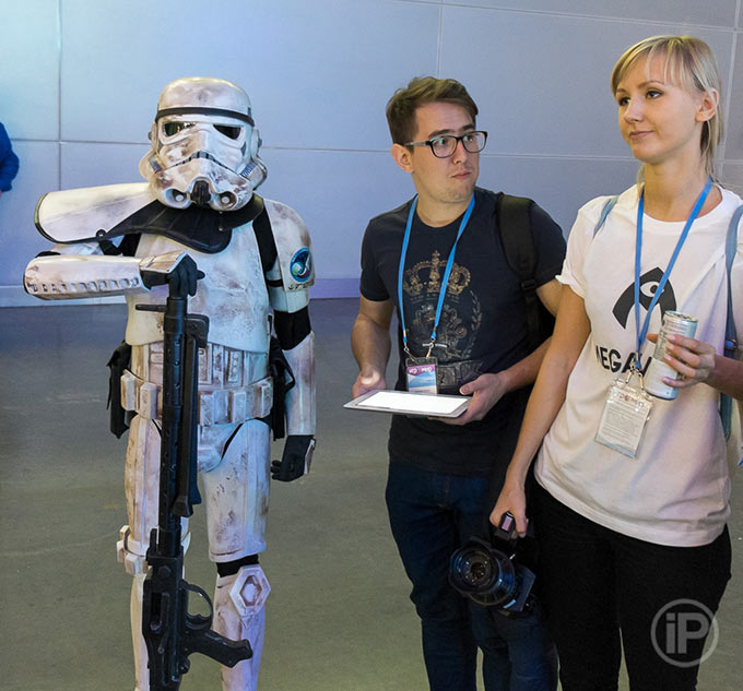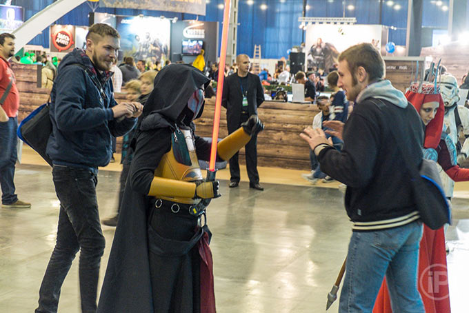 Но, давайте обо всем расскажем по порядку. Пробравшись на выставку особой дорогой для представителей прессы, сэкономившей нам прилично времени (естественно, предварительно нужна была регистрация и прочая бюрократия, но это всегда так) мы сразу, так сказать, «с порога» окунулись в атмосферу дикого игрового мира. Почему дикого? Вначале дорогу преградил некий ситх из вселенной «Звёздных Войн», но он отвлекся на какого-то особо наглого посетителя…