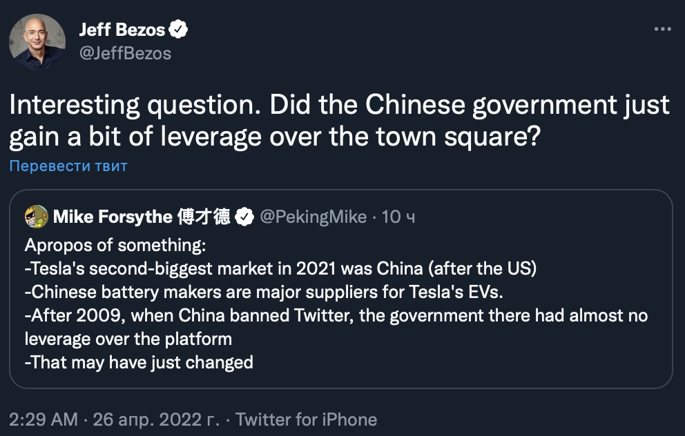 Это заявление решил проверить Джефф Безос. Он процитировал твит журналиста New York Times, в котором говорилось, что у Китая, возможно, появятся рычаги воздействия на Twitter через Маска, поскольку страна является вторым по величине рынком Tesla.