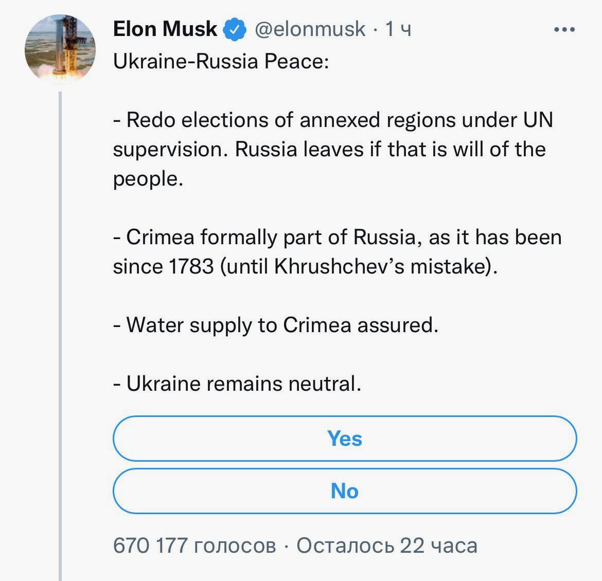 Илон Маск написал в Твиттере четыре пункта, которые должны сделать Россия и Украина для достижения мира между друг другом:
