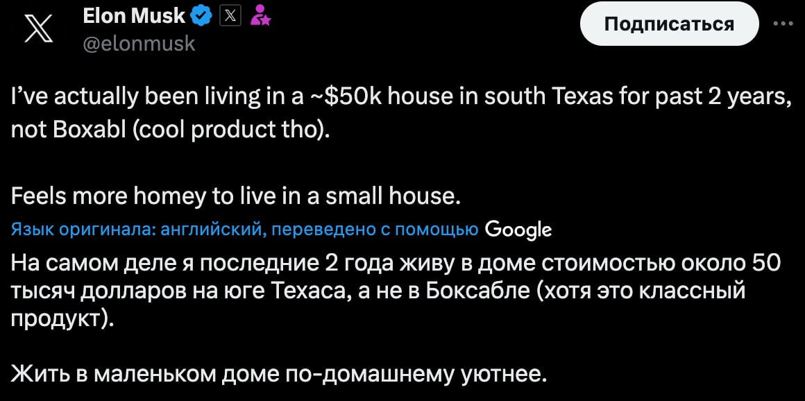 Путаница, вероятно, возникла из-за того, что Маск написал в X, что живет в небольшом доме стоимостью $50 тысяч на территории SpaceX в Техасе. Однако, позже Маск уточнил, что это не дом Boxabl.