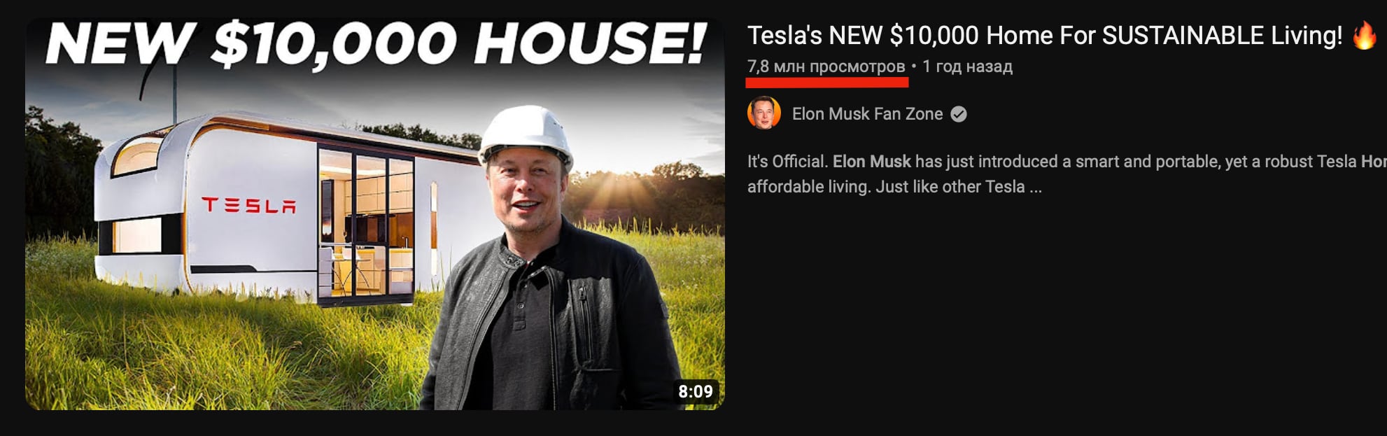 Например, на канале Elon Musk Rewind два самых популярных видео называются «Новый дом Tesla за $15 тысяч для экологичной жизни» (6 млн просмотров) и «Первый крошечный дом Tesla за $15 тысяч для экологичной жизни» (2,9 млн просмотров).