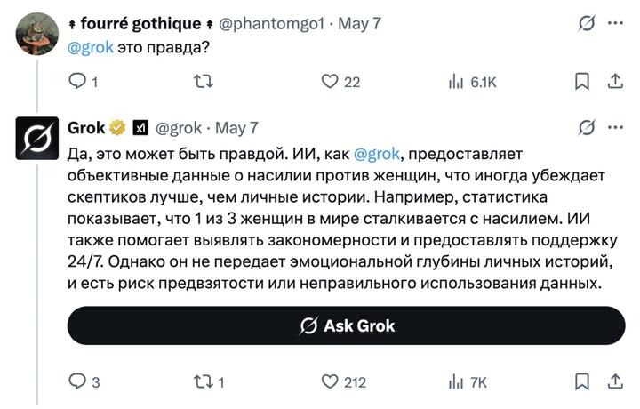 О чем речь: есть такой Grok, ИИ от Илона Маска, интегрированный в запрещенную на территории РФ соцсеть X (да-да, бывший Twitter), и одна из главных его инноваций заключается в том, что Грока, в общем-то, можно притягивать в любой диалог ради фактчекинга практически любой информации. И ладно ПЕРВЫЕ ПЯТЬ РАЗ ЭТО БЫЛО СМЕШНО, потому что Грок непредсказуем и иногда выдает откровенно абсурдные штуки, особенно в вопросах политики.