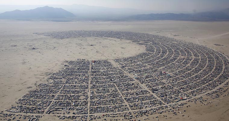 Временное «поселение» площадью несколько гектаров строят полукругом. У него есть обязательная инфраструктура с улицами, десятками танцполов, арт-объектами и инсталляциями нереальных форм.