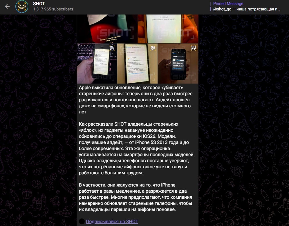 Telegram-канал SHOT опубликовал новость, в которой сообщил, что iPhone с iOS 26, включая старый iPhone 5S, приходят в негодность.