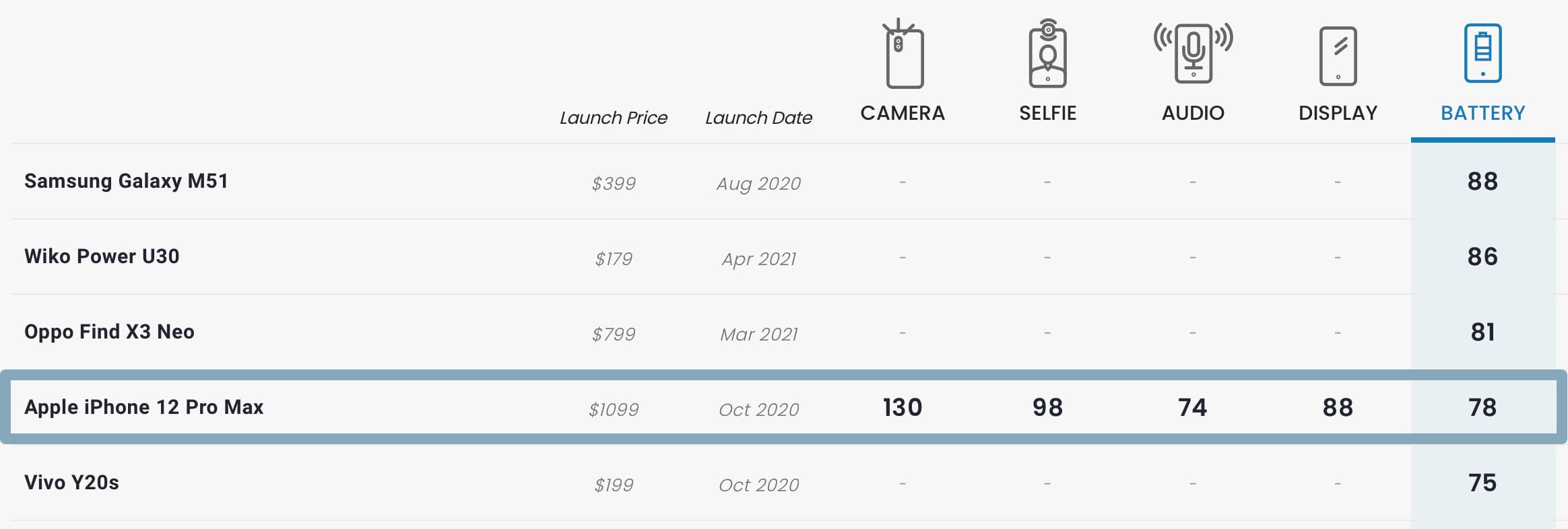 iPhone 12 Pro Max занял в нем четвертое место, набрав 78 баллов. Он уступил Oppo Find X3 Neo, Wiko Power U30 и Samsung Galaxy M51.