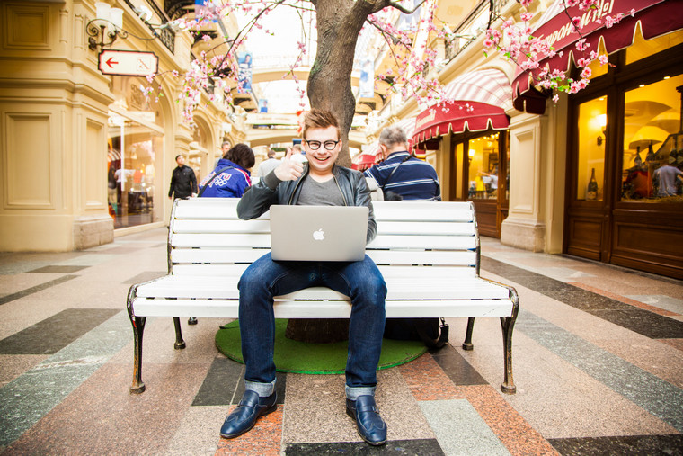 В ГУМе молодой человек отдыхает на скамейке. MacBook Air – незаменимый помощник в его повседневных задачах. И просто модный аксессуар, чего таить.