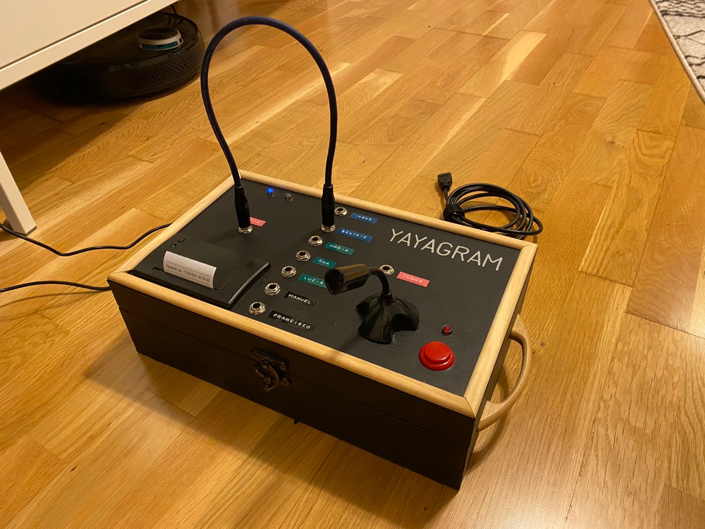 Коробка Yayagram (yaya в переводе кастильского сленга означает «бабушка») напоминает телефонный коммутатор. Внутри нее установлен компьютер Raspberry Pi 4, микрофон и принтер, похожий на те, что используются в терминалах на кассах.