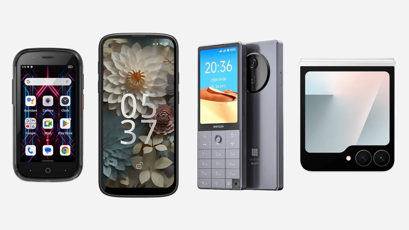 Слева направо: Unihertz Jelly Star, Unihertz Jelly Max, Xiaomi Qin F25 и Samsung Galaxy Z Flip7 FE