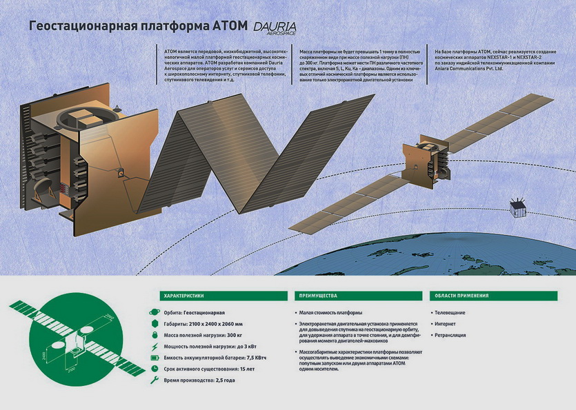 Ещё одна платформа, АТОМ, для создания геостационарных космических аппаратов рабочей массы до тонны. Высокая эффективность аппаратов позволяет выводить их с минимальными затратами, обеспечив высокую конкурентноспособность.