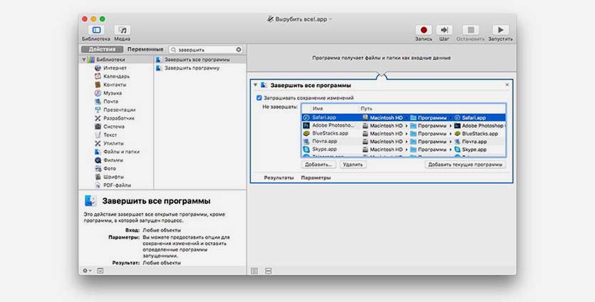 2. В библиотеке действий находим пункт «Завершить все программы».
