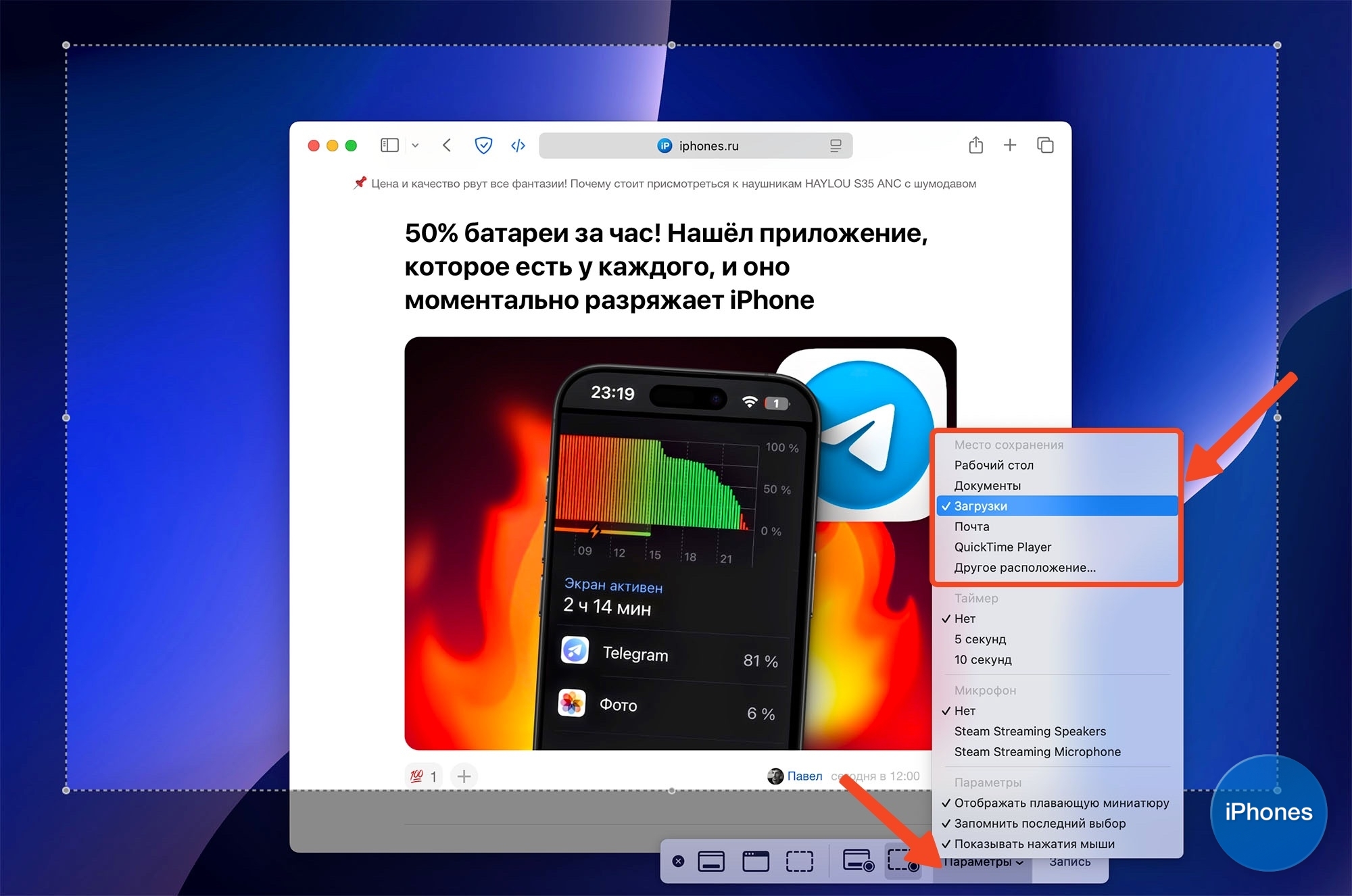 Для этого нажмите Command + Shift + 5, в открывшемся меню выберите Параметры и укажите нужную папку.