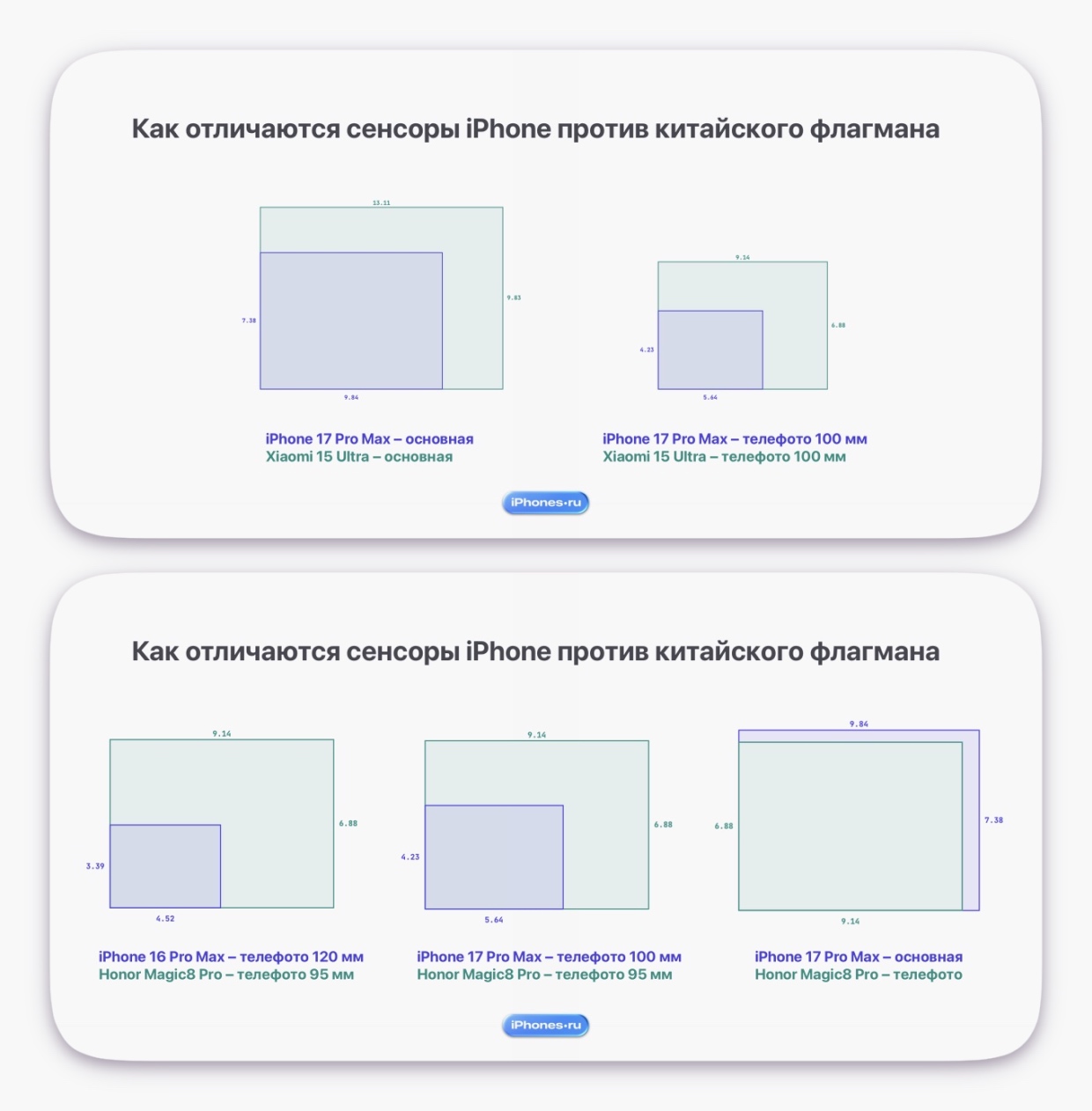 Насколько крупнее сенсор китайских флагманов против iPhone 17 Pro Max